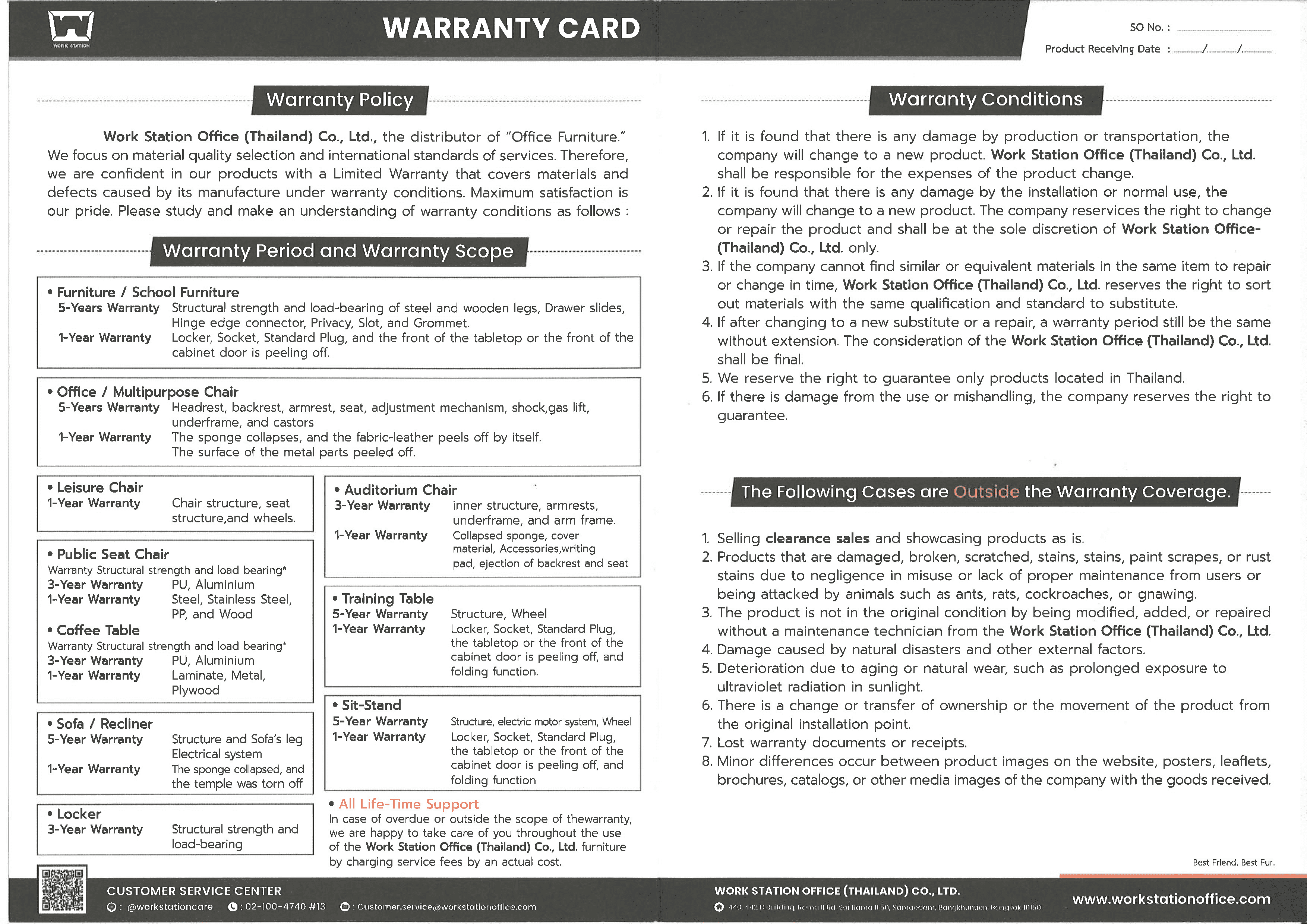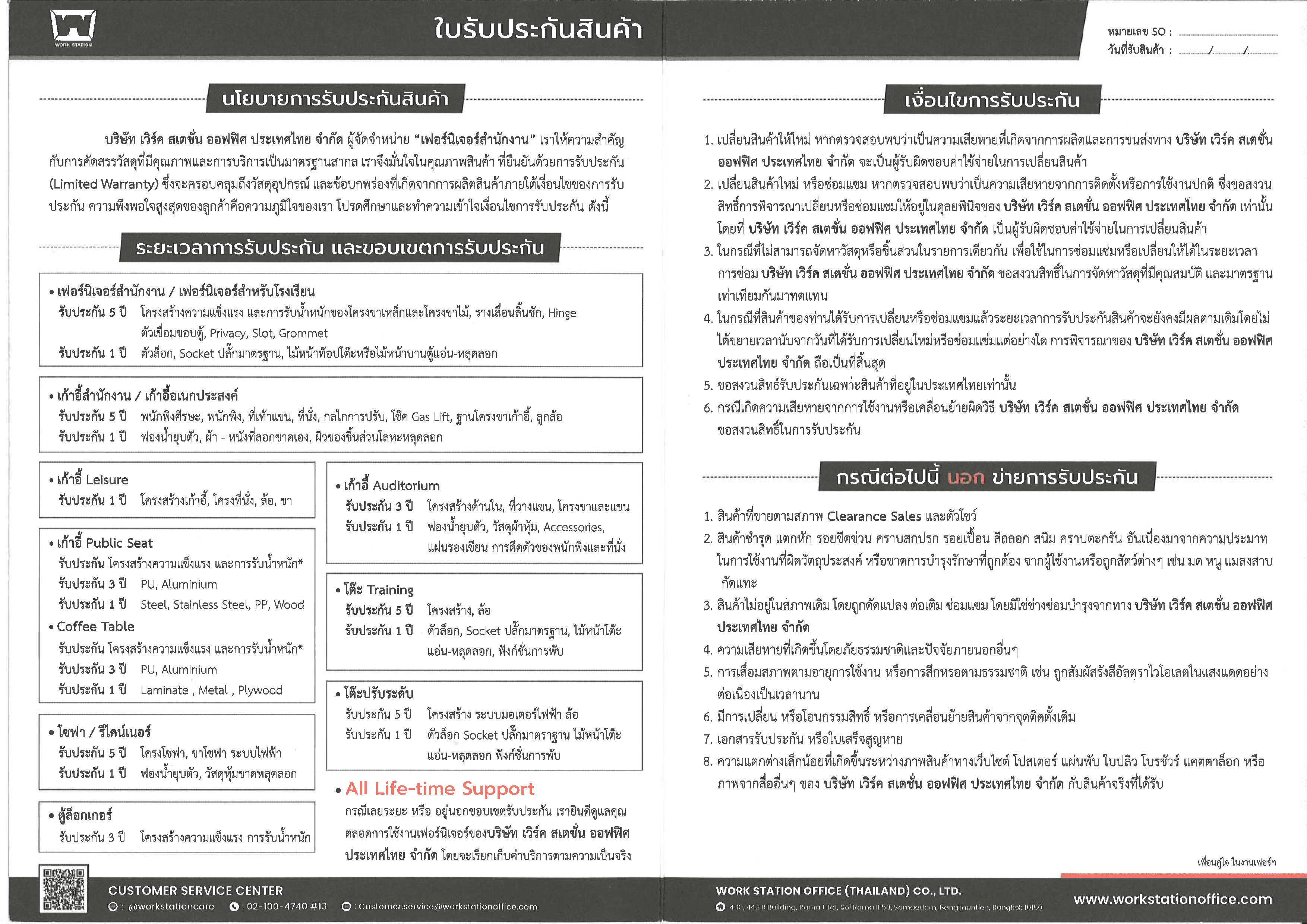 Add Your Heading Text Here Add Your Heading Text Here นโยบายการรับประกันสินค้า WORKSTATION OFFICE FURNITURE ผู้จัดจำหน่าย “เฟอร์นิเจอร์สำนักงาน” เราให้ความสำคัญกับการคัดสรรวัสดุที่มีคุณภาพและการบริการเป็นมาตรฐานสากล เราจึงมั่นใจในคุณภาพสินค้า ที่ยืนยันด้วยการรับประกัน (Limited Warranty) ซึ่งจะครอบคลุมถึงวัสดุอุปกรณ์ และข้อบกพร่องที่เกิดจากการผลิตสินค้าภายใต้เงื่อนไขของการรับประกัน ความพึงพอใจสูงสุดของลูกค้าคือความภูมิใจของเรา โปรดศึกษาและทำความเข้าใจเงื่อนไขการรับประกัน ดังนี้ ช่องทางการติดต่อการรับประกันสินค้า LINE : @workstationcare 095-424-4166 customer.service@workstationoffice.com